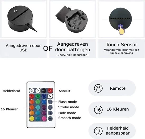 Cre?er een magische sfeer in je huis door middel van deze 3D nachtlamp. Dankzij het innovatie systeem wordt het licht verspreid over de acrylplaat en komt het figuur tot leven door middel van een optische illusie. Met keuze uit wel 16 verschillende tinten van warm-witte LED kleuren is hij ideaal te gebruiken als sfeerlamp, nachtlamp, tafellamp of leeslamp. Neem deze blikvanger in huis en geniet van de magische sfeer om je heen!