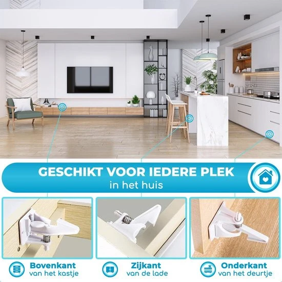 De veiligheidssloten zijn te gebruiken voor allerlei kasten en lades voor volledige veiligheid in huis. Gebruik ze in je keuken, badkamer, slaapkamers, voorraadkasten en andere opslagruimten. Dit product bestaat dan ook uit 12 veiligheidssloten voorzien van 3M tape waarmee vrijwel alle belangrijke delen van het huis beschermd kunnen worden.