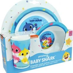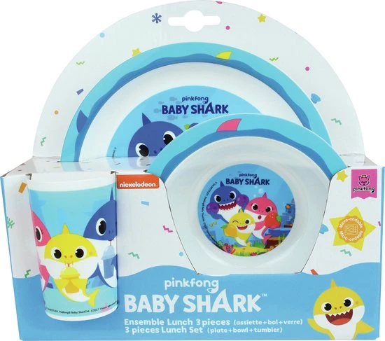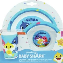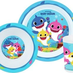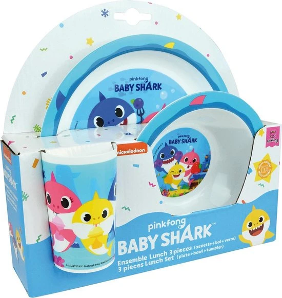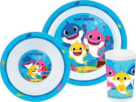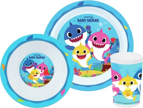 Baby Shark Ontbijtsetje. Een setje wat voor elke maaltijd te gebruiken is; ontbijt, lunch, diner. Het leuke dessin van Baby Shark maakt dit setje, wat bestaat uit een bord, kom en beker, helemaal af!