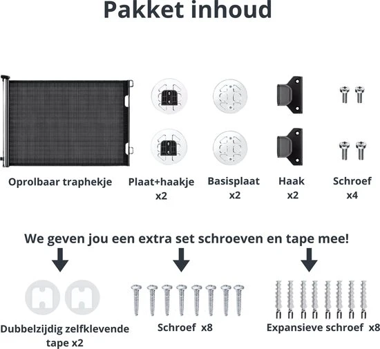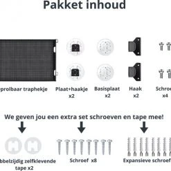 Het oprolbaar traphekje van Babybond is zelfklevend! Dat wil zeggen dat je dus geen gaten hoeft te boren in jouw muur. Toch geven wij je een extra set schroeven mee in de verpakking zodat jij de keuze hebt of je het kinderhekje wil boren of niet. Doordat ons traphekje zelfklevend is kan het worden ge?nstalleerd in 3 minuten en is het geschikt voor elk interieur zowel binnen als buiten.