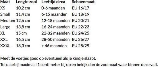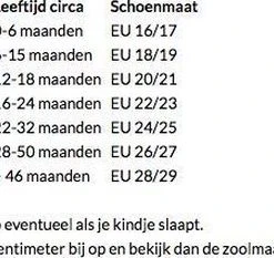 Maat EUR 20/21 (Medium) heeft een binnenzool van 12,6cm, leeftijd indicatief 12-18 maanden. Kijk voor de complete maattabel op de laatste foto.