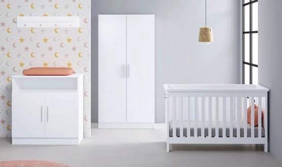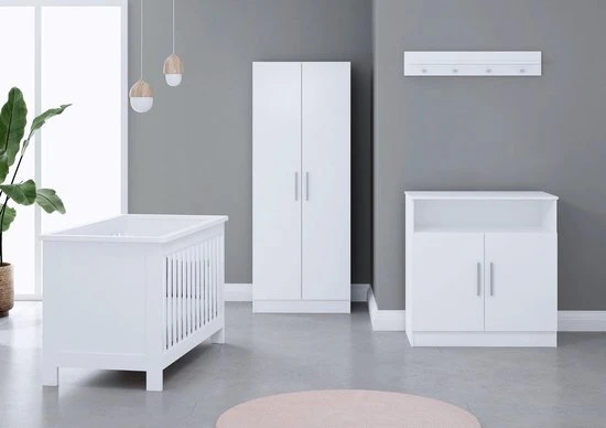 De meubels uit deze prachtige babykamer zijn gemaakt van wit gelakte meubelplaten, welke afgewerkt zijn met deco fineer.