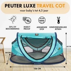 De DERYAN Peuter Luxe is d? ideale oplossing ?n vervanging van het zware campingbedje. Laat je niets meer in de weg staan met deze compacte, lichtgewicht & pop-up reistent. De DERYAN Peuter Luxe biedt een ultieme bescherming tegen zon, muggen en andere insecten. Met zijn 2,4 kg neem je ?m in een handomdraai mee naar ouders, familie, vrienden, vakantie of de wereldreis van je dromen! Ondenkbaar veel mogelijkheden!