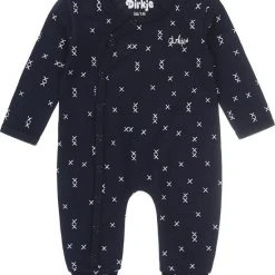 Stoer Dirkje babypakje voor jongens. Dit pakje is gemaakt van biologisch katoen is navy gekleurd met een all over print van off-white kruizen. Aan de onderkant van het pakje zit een omslagboord met een off-white met navy gestreepte binnenkant.