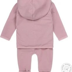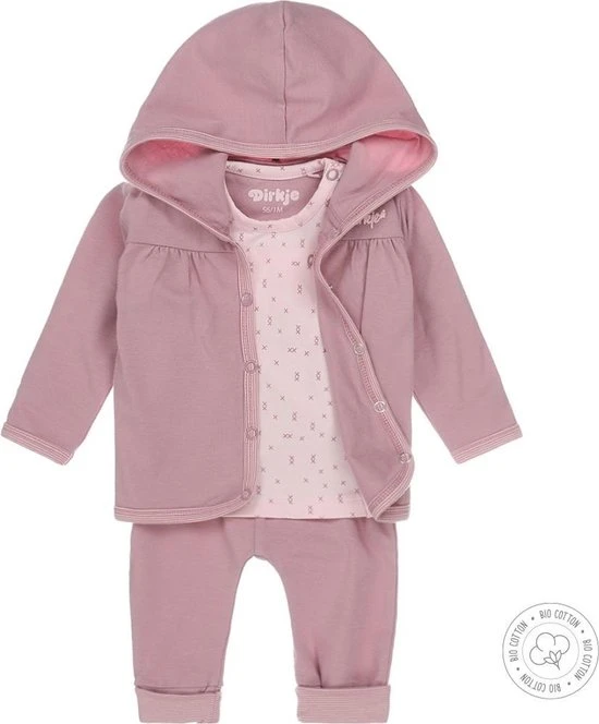 Schattig 3-delig Dirkje babypakje voor meisjes. Het vest en het broekje zijn mauve van kleur. Het broekje bevat een omslagboord met een horizontaal gestreepte mauve met licht roze binnenkant. Het shirtje is licht roze van kleur en voorzien van mauve accenten.