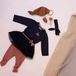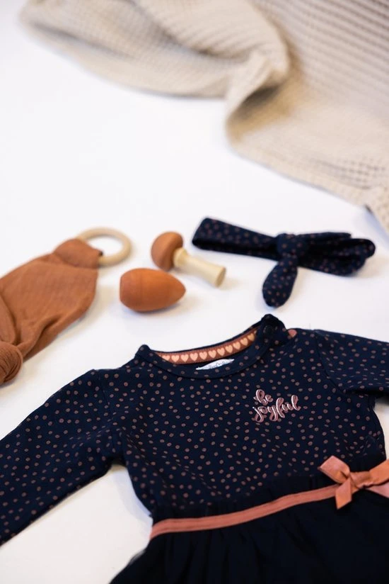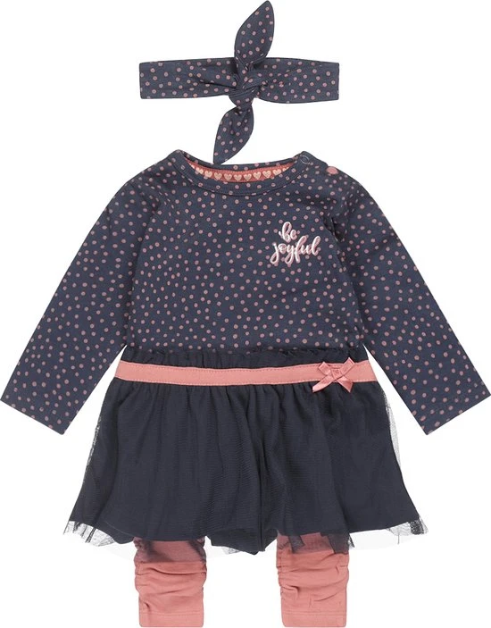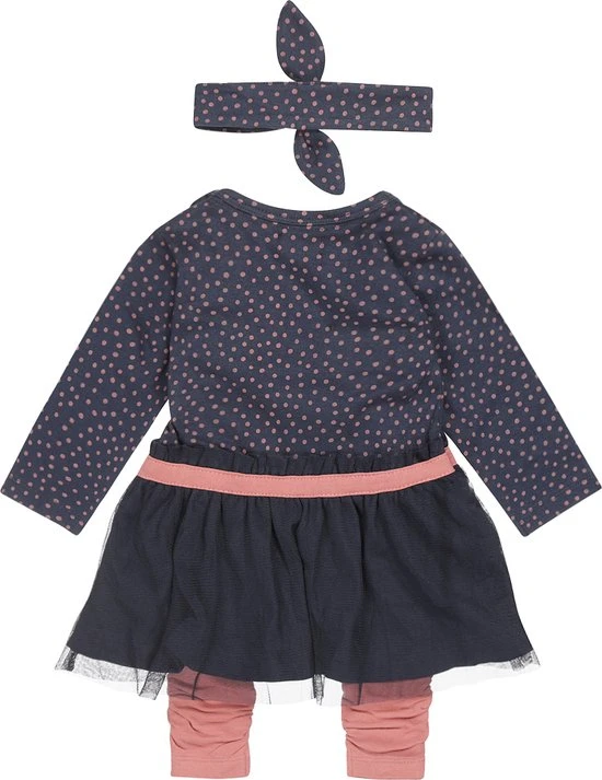 Een feestje, dit 2 delig meisjes Dirkje set. De set bestaat uit een jurk, een legging en een haarband. De jurk is donkerblauw van kleur. Het bovengedeelte is donkerblauw met roze stipjes en het rokgedeelte bestaat uit zachte donkerblauwe tule. De taille heeft een schattig roze bandje met strik. Met de bijpassende roze legging en de blauwe haarband maak je de outfit van je kleintje helemaal af! De maatjes tot en met 86 sluiten met drukkers op de schouder.