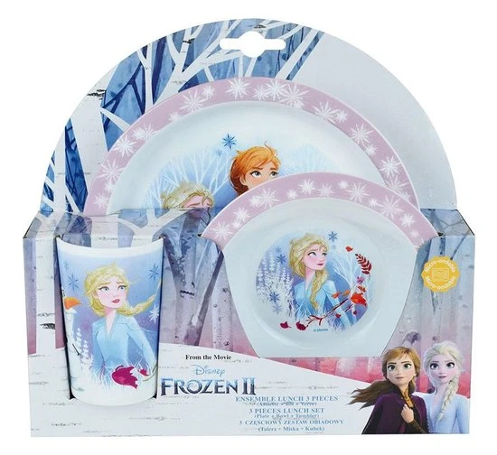 Disney Frozen 2 Lunch set 3 delig. Deze geweldige ontbijtset is helemaal in Frozen stijl. Je ochtend wordt zoveel beter en vrolijker als je aan de ontbijttafel aanschuift! De set bestaat uit een bord, beker, en kom met mooie prints van Elsa, Anna en Olaf.
