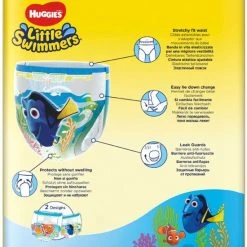 Huggies? Little Swimmers? zwemluiers zijn speciaal ontworpen voor baby’s jonger dan 6 maanden. Door de verstelbare, rekbare zijkanten heeft het broekje een comfortabele pasvorm die goed blijft zitten tijdens het spelen in het water. De broekjes zijn gemaakt van uniek absorberend materiaal, zodat deze niet opzwelt als een luier. Plus speciale anti-lekrandjes die beschermen tegen kleine ongelukjes. Dankzij de leuke, kleurrijke Disney?-designs zien ze eruit als gewone zwemkleding. En wanneer de waterpret is afgelopen, zorgt de rekbare tailleband ervoor dat je gemakkelijk het broekje uit kunt trekken tijdens het omkleden.