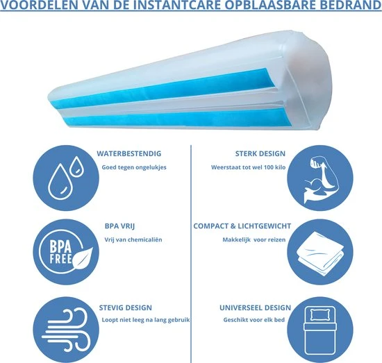 De traditionele bedrand/bedhek is verleden tijd! Kies vandaag voor de Instantcare opblaasbare bedrand. Onze bedrand is enorm compact en snel te installeren als je ergens gaat logeren of als je op vakantie gaat. De opblaasbare bedrand is natuurlijk ook voor thuis gebruik! Hij past in elk bed daarin is onze bedrand universeel.