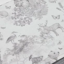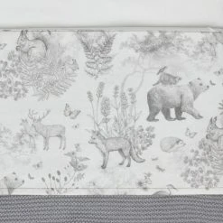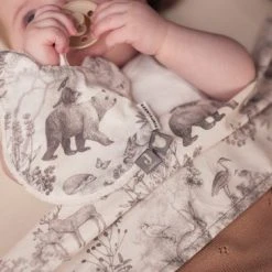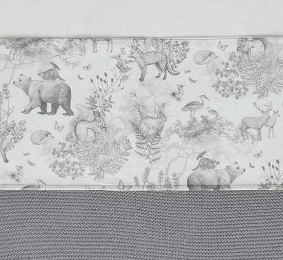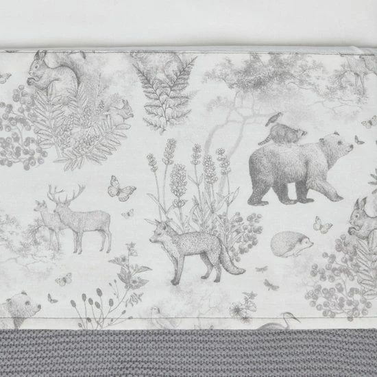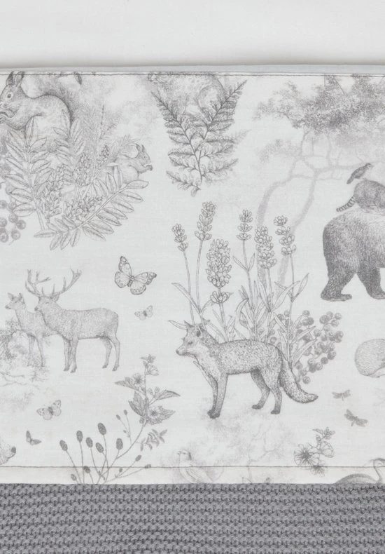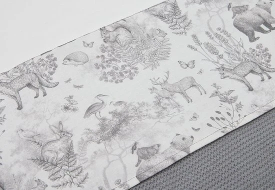Op elk item zie je het lieve bosdieren printje terug, sommige met een grote panelprint, sommige met een all-over printje. De print heeft een off-white ondergrond met een grijze print.