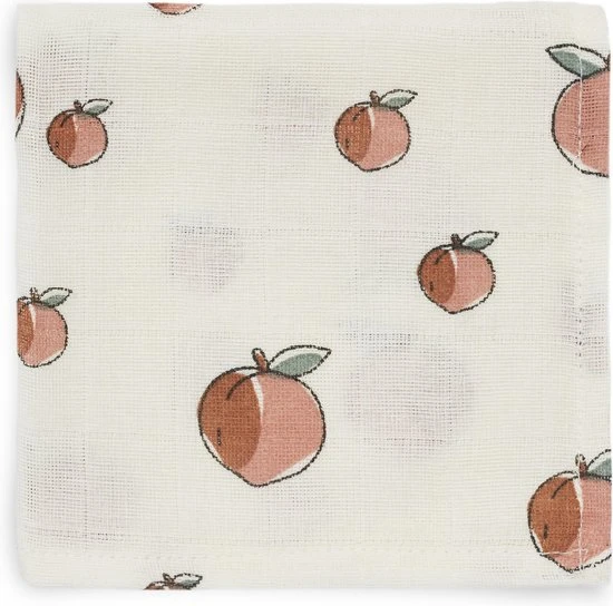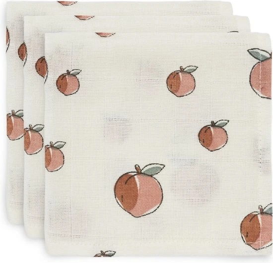 De monddoekjes worden geleverd in een 3-pack. Alle 3 de monddoekjes hebben het gezellige fruitprintje met perzikjes. De doekjes kun je lekker heet uitwassen zodat ze altijd weer hygi?nisch te gebruiken zijn. Je mag ze wel strijken maar slim om dat juist niet te doen. Ongestreken hydrofiel doeken nemen meer vocht op.