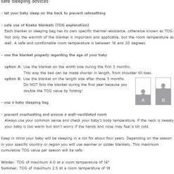 Wij snappen dat het lastig kan zijn om te bepalen welke deken je nu het beste kunt kopen. De juiste keuze hangt af van een aantal factoren en daarom heeft Koeka een keuzehulp samengesteld om je op weg te helpen. Deze “How to choose your blanket” keuzehulp vind je tussen de afbeeldingen. Meet de kamertemperatuur van je kinderkamer en bepaal wat de TOG waarde is van de slaapzak, pyjama en lakentje (als je die gebruikt). Raadpleeg daarna de keuzehulp om te bepalen wat het advies is voor de minimale en maximale TOG waarde van je deken.