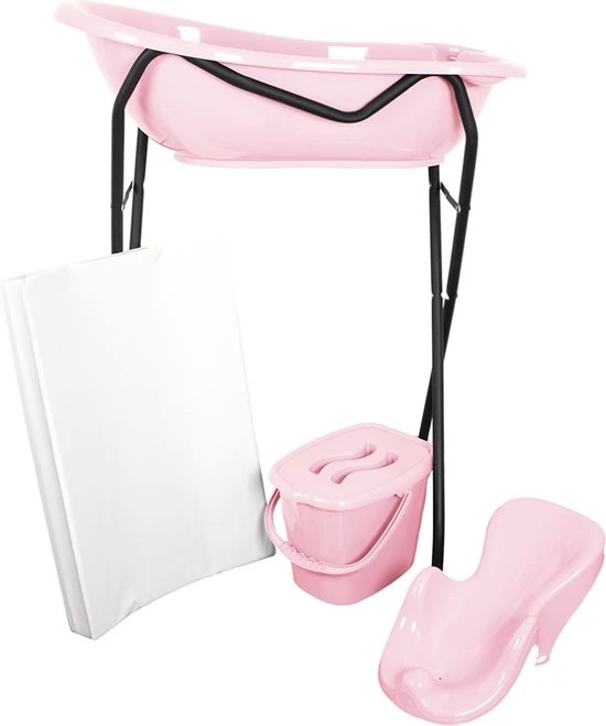Het badje heeft een mooie vorm en is inclusief afvoer. Het badzitje kan gemakkelijk in het badje geplaatst worden door middel van zuignappen. De standaard is van metaal gemaakt met rubberen voetjes om de vloer te beschermen en is gemakkelijk in te klappen. Op het waskussen kun je je kindje verschonen en de luiers gooi je met gemak in de luieremmer! Kortom: deze badset is onmisbaar in de babykamer!