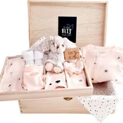 *Elke babybox wordt individueel en met zorg en liefde samengesteld. Het kan daarom zijn dat ivm de beschikbaarheid sommige artikelen ietsje kunnen afwijken dan dat op de foto’s staat afgebeeld. Het houten kistje is een natuurproduct, het kan voorkomen dat er een bustje of andere natuurlijke verkleuring zich voor doet.