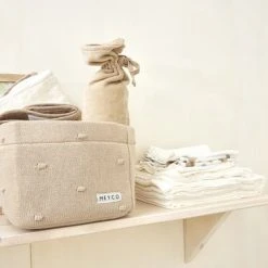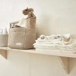 De commodemand is verkrijgbaar in diverse kleuren en in een small en medium variant met de afmetingen: small 21x16xh16 cm en medium 26x19xh16 cm. De binnenkant kun je afnemen met een vochtig doekje. Dus mocht er een flesje of potje lekken dan is er niets aan de hand en maak je het zo weer schoon. Mix en match het mandje met de rest van de Meyco Baby collectie en cre?er een complete look in de babyslaapkamer.