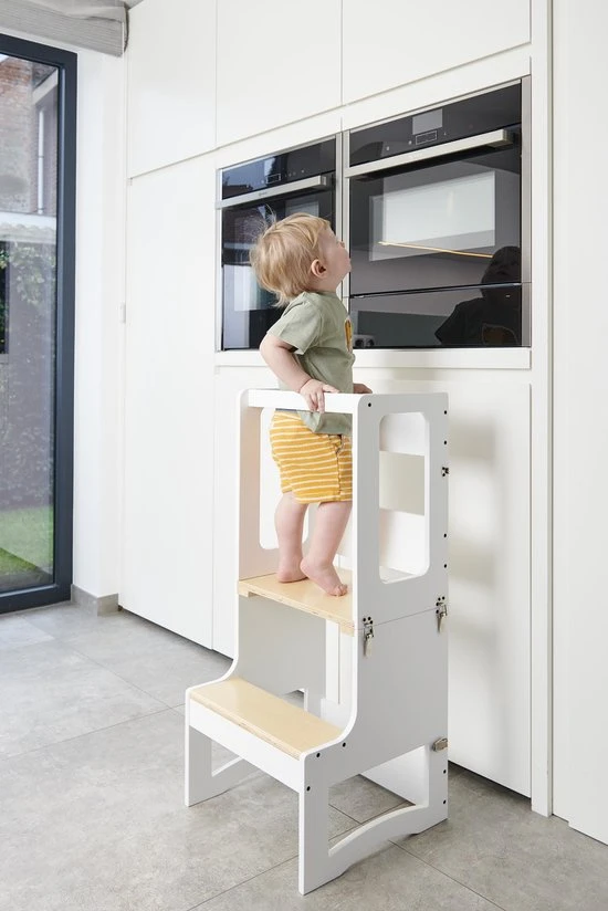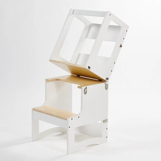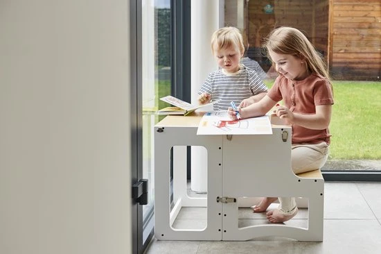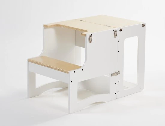 Deze leertoren kan zich omvormen tot een tafel op maat van jouw kindje. Bovenop de gebruiksmogelijkheden in hoogstand kan je de leertoren dus ook gebruiken voor knutselactiviteiten of vieruurtjes.