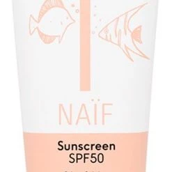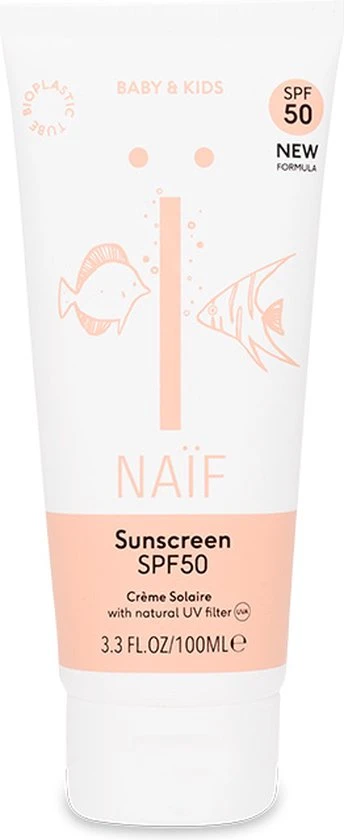 Na?f Zonnebrandcr?me voor Baby & Kids SPF50 beschermt de kwetsbare baby- en kinderhuid optimaal tegen UVA en UVB straling. De zonnebrandcr?me heeft een natuurlijke filter afkomstig van het mineraal zinkoxide (non-nano). Dit maakt een natuurlijke UV filter zeer geschikt voor kinderen met een gevoelige huid, minimaliseert een huidreactie en beschermt direct. Ook fijn: de cr?me is waterbestendig, trekt snel in en laat geen witte waas achter. Sun, Sea and Sorry Free, dus.