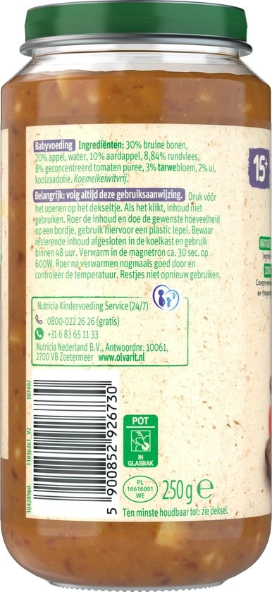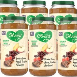 6-pack Olvarit Bruine Bonen Appel Rundvlees Aardappel, geschikt voor baby?s vanaf 15 maanden oud. Een babyhapje met een herkenbare smaak & textuur dat bijdraagt aan de smaakontwikkeling.