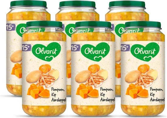 6-pack Olvarit Pompoen Kip Aardappel, geschikt voor baby?s vanaf 15 maanden oud. Een babyhapje met een herkenbare smaak & textuur dat bijdraagt aan de smaakontwikkeling.