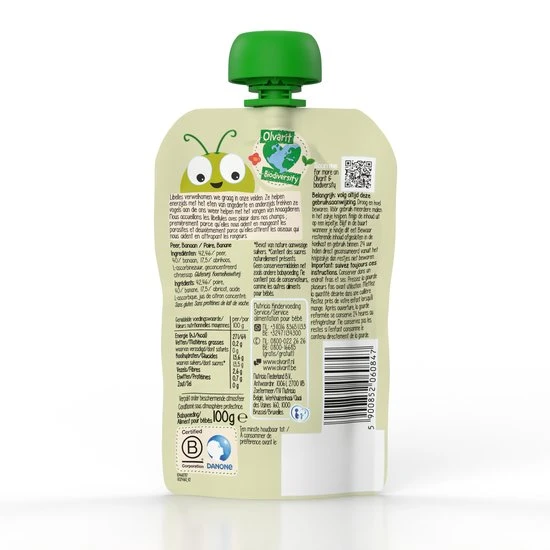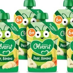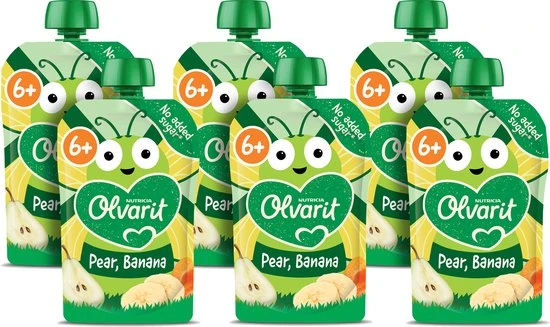 Olvarit Knijpfruit Peer Banaan, geschikt voor baby’s vanaf 6 maanden oud.