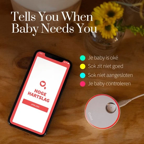 - Vertelt je wanneer je baby je nodig heeft: Basisstation en Owlet-app geven meldingen wanneer meetwaarden buiten de ‘veilige’ zones komen.