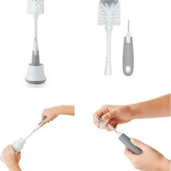 De flessenborstel heeft zachte en ruwe haren, voor een zachte reiniging en grondige poetsbeurt. Hij is flexibel en past in alle flessen. In de zachte handgreep met antislip zit een siliconen borsteltje voor de spenen van papflessen en borstpompen. De buigzame spenenborstel past in alle speentjes. Dankzij luchtgaatjes kan de spenenborstel in het handvat drogen. De staander heeft een handige tuit om het water dat wordt opgevangen uit te gieten.