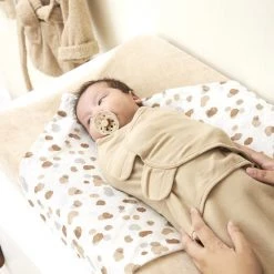 Zorg ervoor dat je de flappen goed strak vastmaakt, maar snoer je baby niet helemaal in. Laat de armpjes het best gestrekt langs de zijkant van het lichaam liggen en leg je baby tijdens het inbakeren altijd op zijn of haar rug.