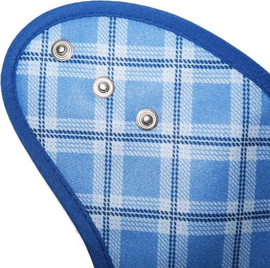 3-laags slab met PU in het midden. Voorzien van 3 YKK drukknopen. Blauwe ruit motief voorzien van blauwe bies. Afmeting 46x95cm.