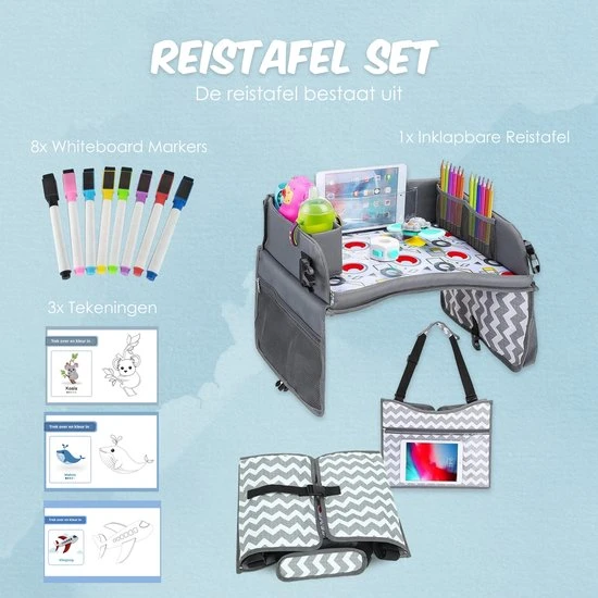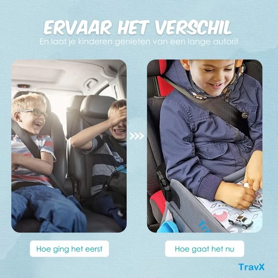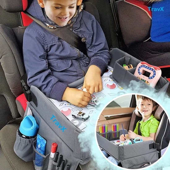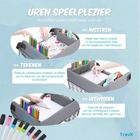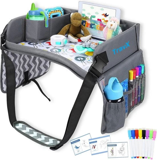Kinderen vermaken tijdens een lange reis blijkt vaak een lastige opgave, maar met de TravX reistafel is dit verleden tijd! Met deze speeltafel zijn kinderen namelijk urenlang zoet met spelen of tekenen. Kinderen kunnen tekeningen eenvoudig onder de whitboard stof van de tekentafel schuiven en deze overtrekken. Ook beschikt de autotafel over een ipadhouder voor het kijken van een filmpje tijdens het eten. Mocht er geknoeit worden is dit ook geen enkele probleem aangezien de travel tray gemakkelijk schoon te maken is. De reistafel voor auto wordt geleverd inclusief whiteboard markers en tekeningen voor urenlang speelplezier!