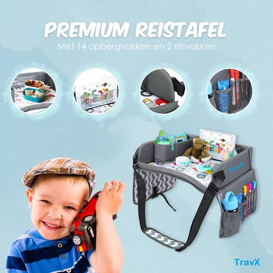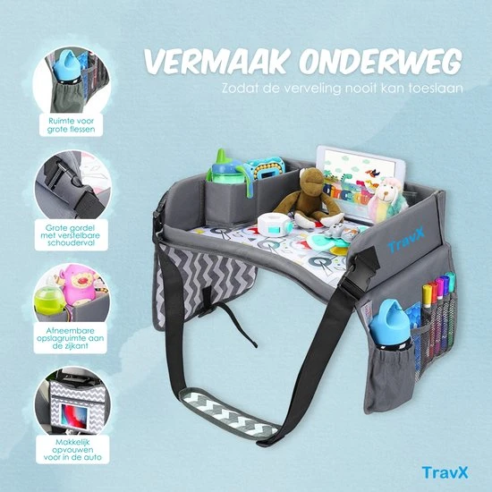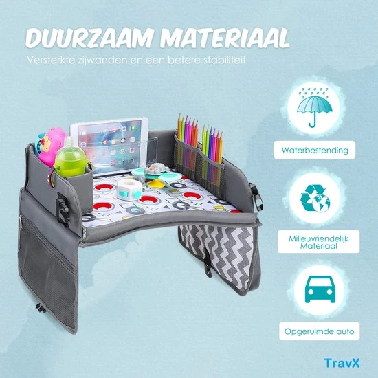 Houd alles bij elkaar in opbergvak van de autotafel In tegenstellingen tot andere autotafels op de markt beschikt de TravX reistafel over een uniek opbergvak met rits. Het opbergen en dus bij elkaar houden van potloden of speelgoed is hierdoor zeer eenvoudig. Dit zal ervoor zorgen dat jij hier nooit meer naar hoeft te zoeken voordat jij op reis gaat met de kids. Alles wordt netjes bij elkaar gehouden en dit zal jou een hoop tijd en frustratie besparen!