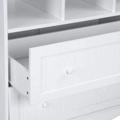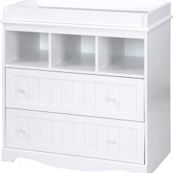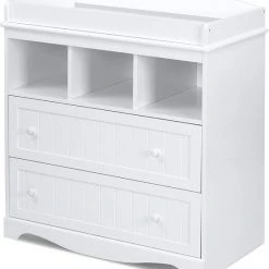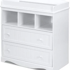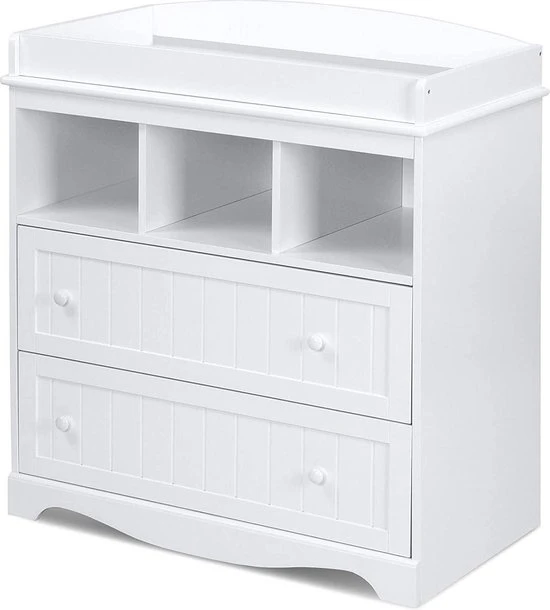 Eenvoudig ontwerp en veel opbergruimte maken deze moderne commode. In twee lades en drie compartimenten is er genoeg ruimte voor luiers, kleding, verzorgingsproducten en al het andere dat altijd bij de hand moet zijn in het dagelijks veranderende leven. Op het royale verschoningsoppervlak kunnen luiers comfortabel worden verschoond. De witte kleur past bij elke kinderkamer en is te combineren met een breed scala aan meubels. Dit meubel kan later gebruikt worden als ladekast.