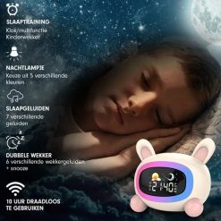 De slaaptrainer heeft meerdere functies, waardoor deze ideaal is om je kind in contact te brengen met een gezond slaapritme. Het is mogelijk om de slaaptrainer in ste stellen op dag- en nacht stand. Op deze manier is er in de nacht als je kleintje moet slapen een maantje te zien, en zodra hij mag opstaan, aangezien de dag weer is begonnen een zonnetje te zien. Het is doormiddel van de digitale klok mogelijk om de slaaptrainer zelf in te stellen op de juiste alarmtijden dat je kleintje mag opstaan. De wekker zal afgaan, die je kleintje vervolgens zelf eenvoudig uit kan zetten. Het licht zal blijven branden, zodat het kleintje weet dat hij/zij mag opstaan.