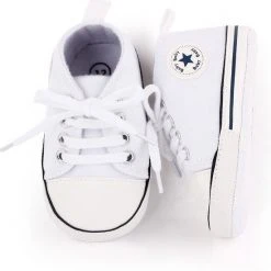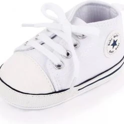 Leuke schattige en stoere baby schoenen.Het is een stevig canvas/textiel baby schoentje met een echte vetersluiting en een zachte zool. Op het zooltje zitten antislip nopjes. Speciaal ontworpen voor baby’s eerste stapjes. De babyschoenen zijn geschikt voor baby’s van 6 tot 12 maanden. De lengte van het zooltje is 12 cm. Dit kan gezien worden als maat 19. De schoentjes zijn er in diverse kleuren. Passend bij ieder outfit en geschikt voor ieder seizoen. Allen zijn voorzien van een ‘baby ster’ logo.